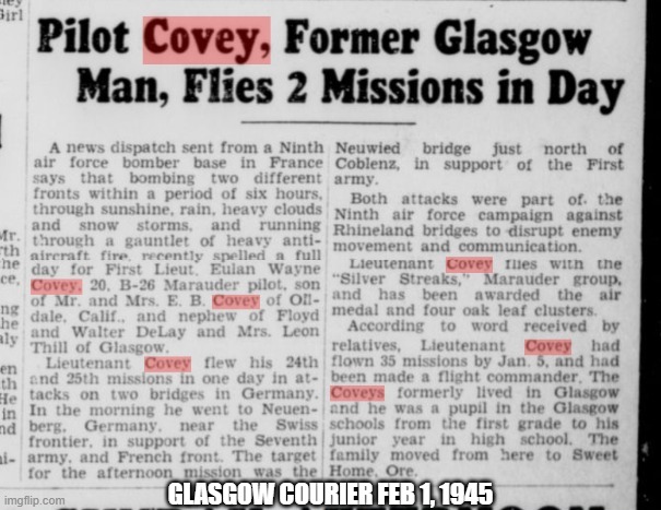 Captain Eulan “Buck” Covey was my Dad’s cousin. He flew a B-26 Marauder bomber in the European Theater during World War II. He completed over 50 missions earning the Air Medal with several oak leaf clusters. He stayed in the Air Force after the war, transferring to jet fighters. Buck was killed in the crash of his F-80A Shooting Star in September, 1950.