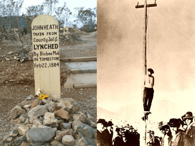 Angered by Heath’s light sentence, a mob formed in Bisbee. Joined by others from Tombstone, they forcibly removed Heath from the Cochise County Jail on the morning of February 22, 1884. His lynching was immortalized by frontier photographer C.S. Fly.