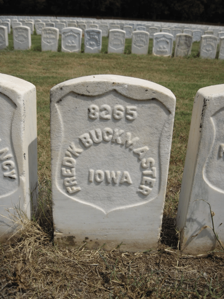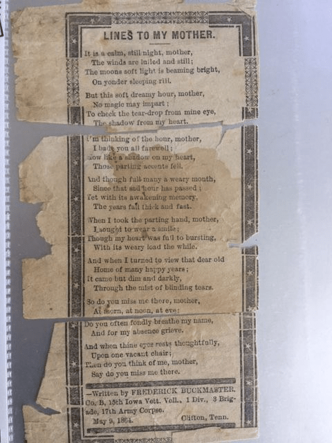 Buckmaster joined the 15th Iowa Infantry on November 12, 1861. He re-enlisted on January 1, 1864. He was wounded and captured by the Confederates during the Battle of Atlanta on July 22, 1864. He was imprisoned at the notorious Andersonville Prison and died there on September 9, 1864 at age 20. His mother was the Grandmother of my Great Grandmother, Nellie De Lay. The poem was preserved by my cousin Jackie Tobin.