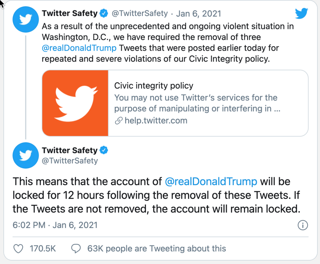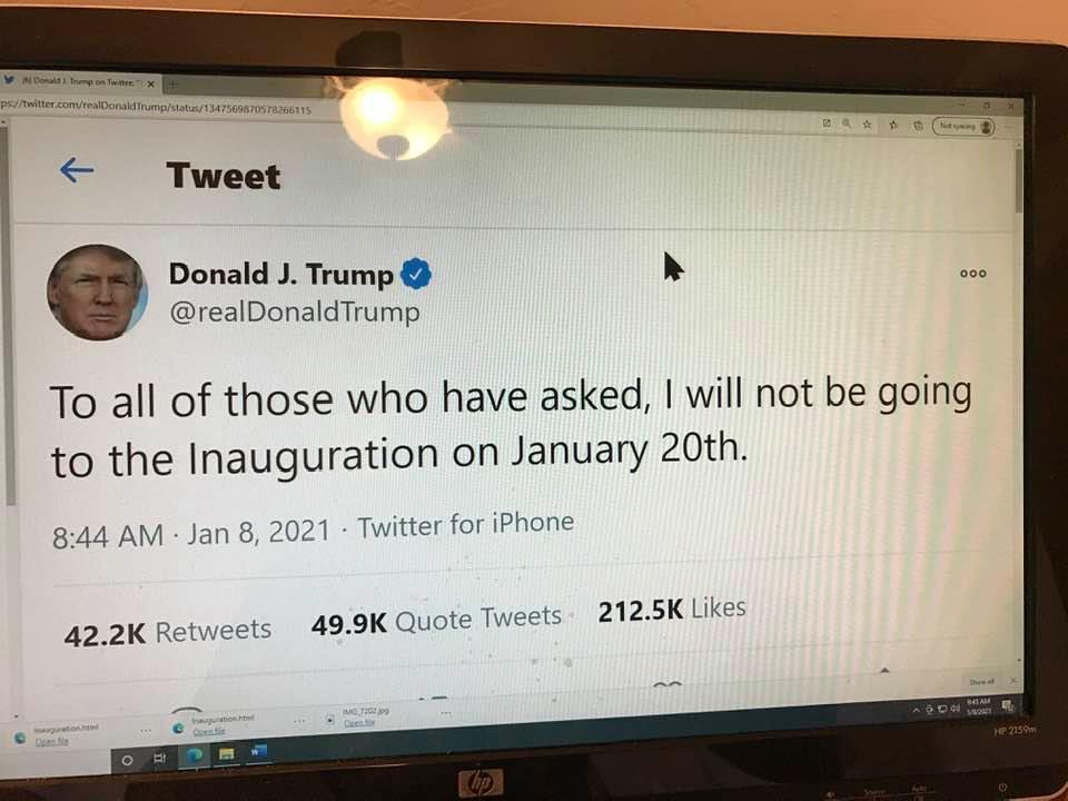 While the insurrection was going on, the President remained in the White House. Leaked reports said he seemed giddy over what was transpiring. At first, he failed to act in any way to restore order, not even calling in the National Guard. (Vice-President Pence who was trapped in a secure location in the Capitol was apparently the one who requested the Guard.) When the National guard did arrive, they reportedly were not armed or equipped for riot duty. Finally, he took to Twitter. Some of his tweets asked for calm and support for law enforcement. In other tweets he continued to air his election grievances. He posted a bizarre video where he praised the insurrectionist with “we love you” and calling them “very special people.” Then he asked them to stop the violence. The video and two other tweets were taken down by Twitter. The President’s account was suspended and he was told to remove the incendiary tweets. Sometime the next day, his account was re-activated. The President, perhaps cowed by fears of removal, posted a slightly conciliatory video.
