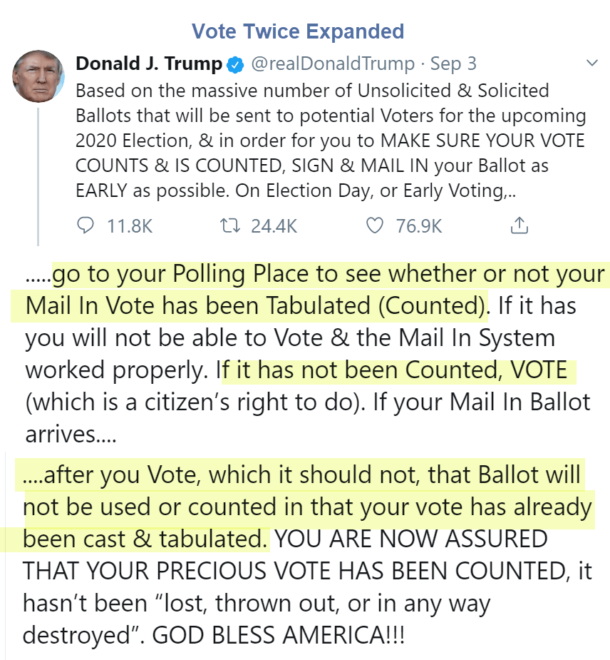 Inexplicably, while questioning the integrity of early ballots, the President urged his supporters to both vote early and show up at the polls. Voting twice is, of course, illegal in most places. Early voters can easily check by phone or on-line to see if their vote was accepted. Showing up at a polling place on election day after one has voted causes confusion and could get the voter arrested. It also makes the line a lot longer for legitimate voters.